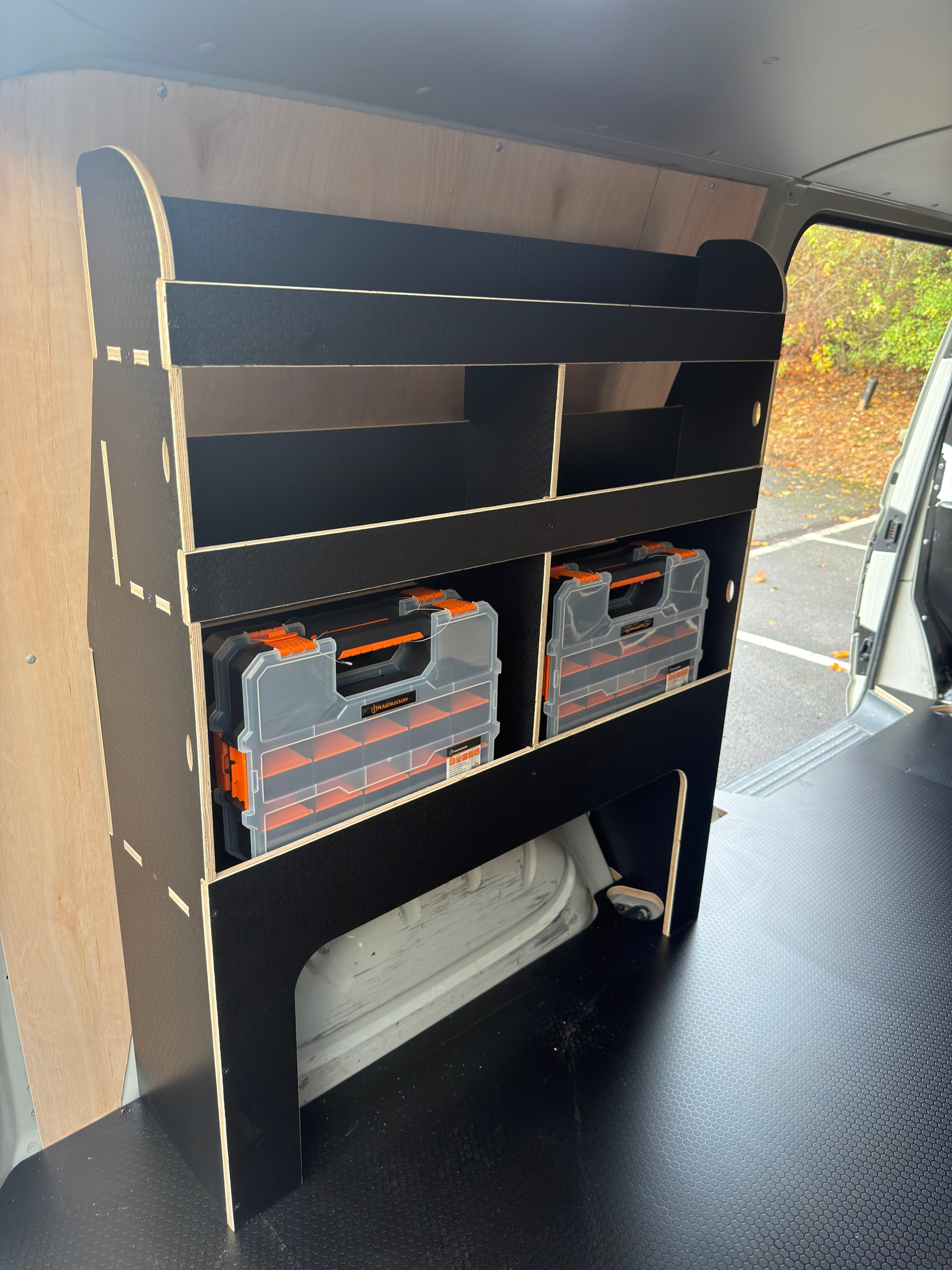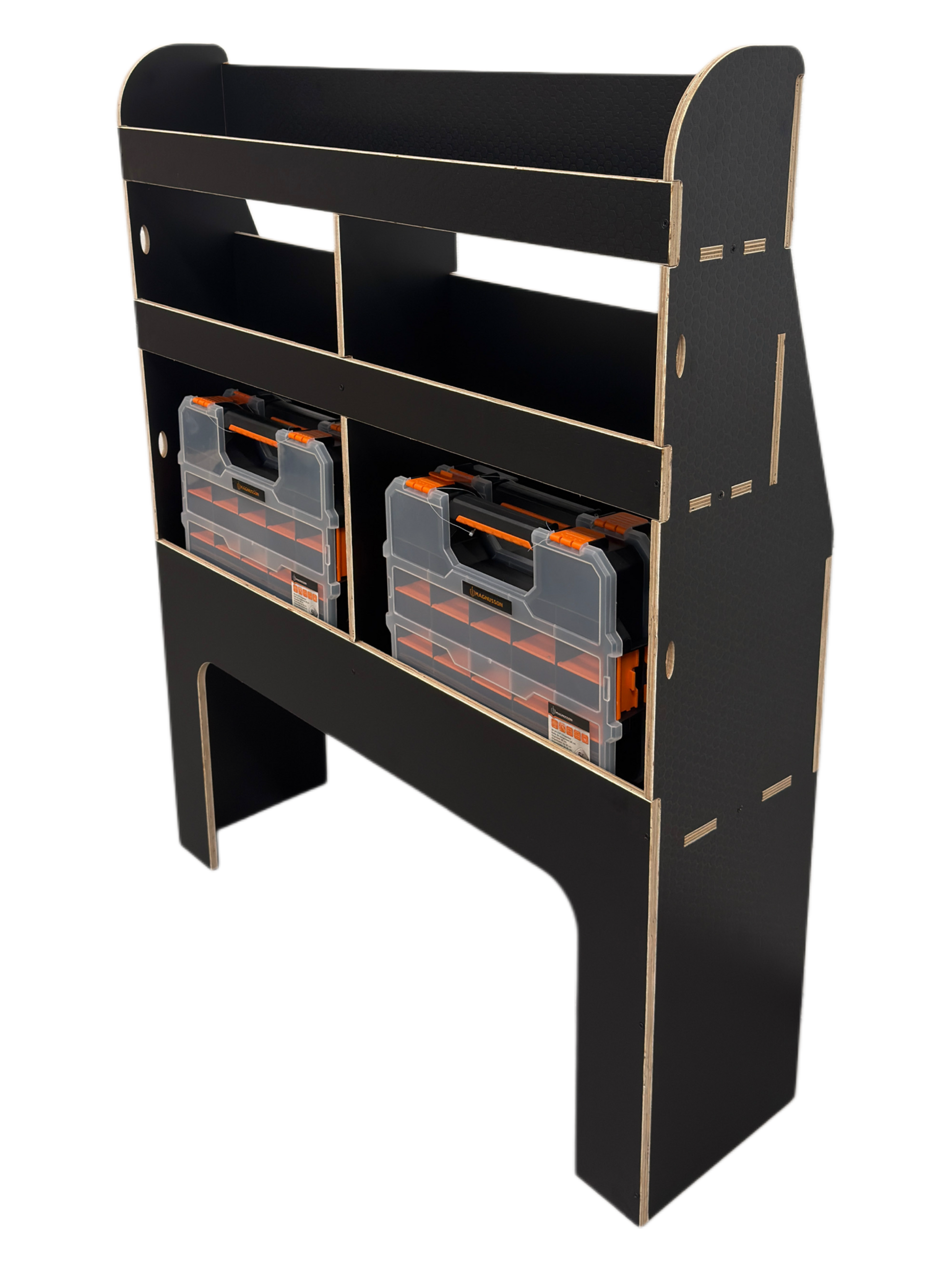 Crafted from premium hardwood plywood with a tough hex-pattern laminate finish, this shelving unit is built to handle the daily demands of tradespeople, service engineers, and mobile professionals. Precision CNC cutting and interlocking joints ensure a tight, rigid fit that maximizes storage while minimizing weight.